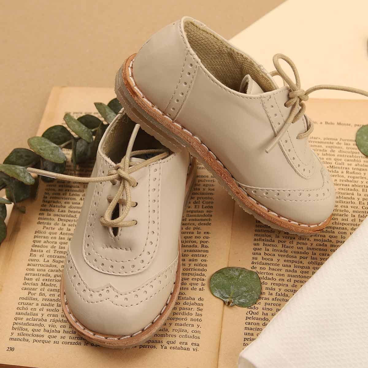Zapato de niño color beige. Elegante modelo para combinar en eventos especiales en familia.